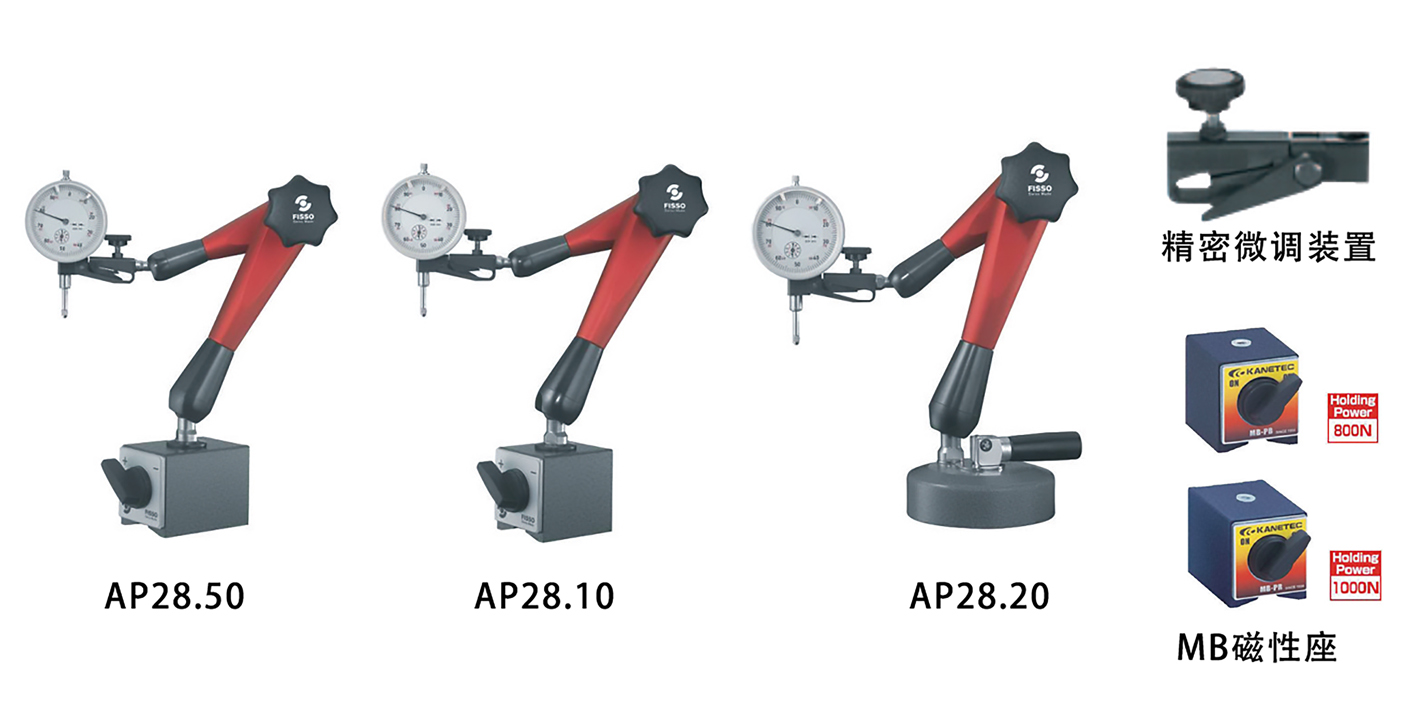 A-28P仅为万向关节臂(P表示0.1mm级精密微调装置);A-20P+M表示万向关节臂带燕尾槽量表架,M表示底座是开关磁力座。V指真空负压基座